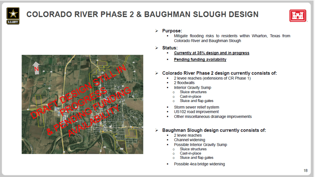 As for what is being proposed, understanding the scope of the project on your specific property is critical. Based on available information, Phase Two includes levee extensions that connect to Phase One, construction of flood walls, the development of sump areas, and the cleaning and widening of existing sloughs and creeks, including improvements associated with the Colorado River and the Baughman Slough area. Each landowner’s situation will vary depending on how these proposed improvements intersect with their property and what rights are being acquired.